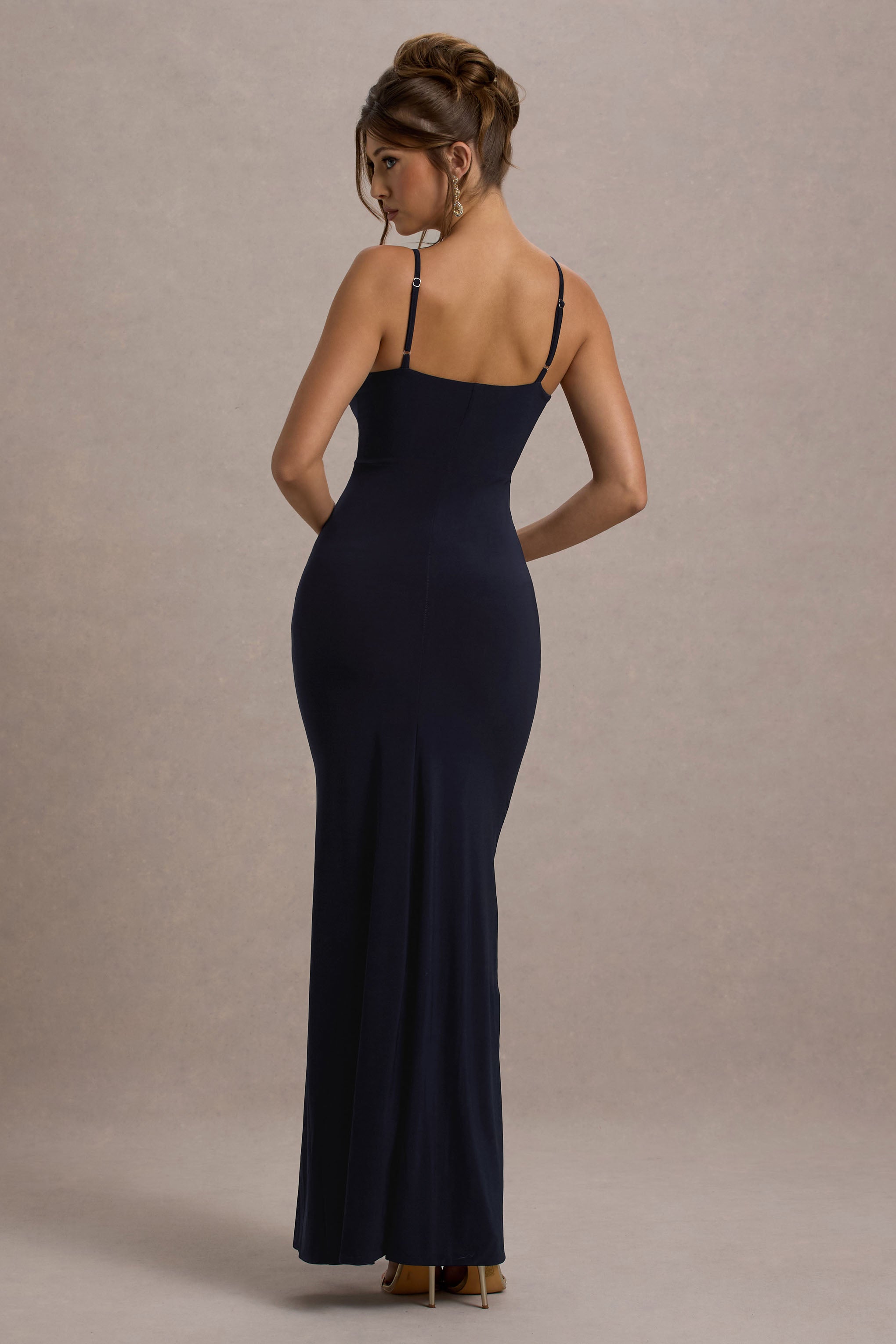 Jeanne | Navy Plunge Ruched Cami Maxi Dress With Split