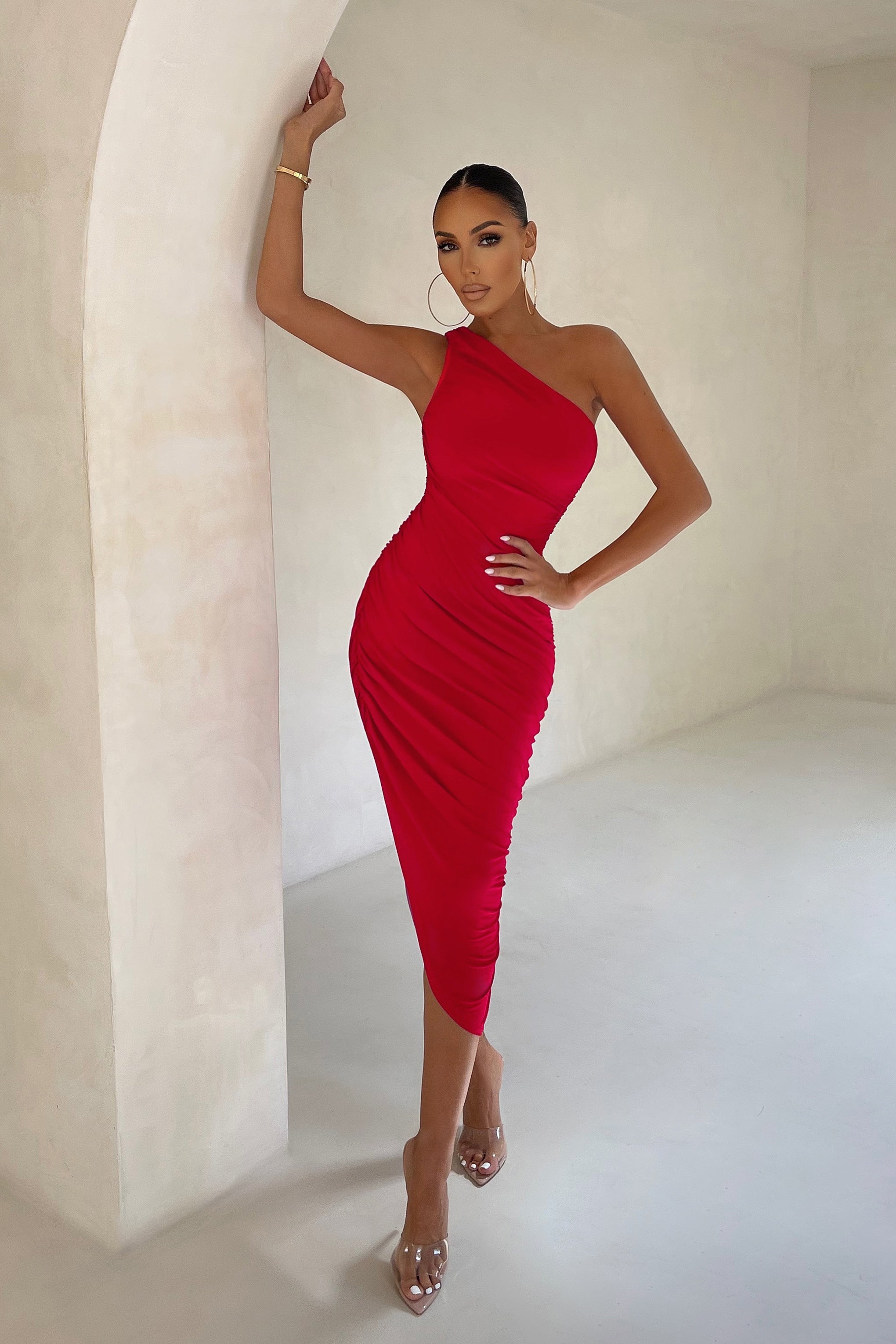 For a wedding guest or race day dress that will captivate but also contour your curves, you needn't look further than this asymmetric midi. Late Night comes in our signature stretch jersey known for it's sculpting and incredible comfort. Style this ruched bodycon dress with gold hoop earrings to complement it's scarlet red hue.